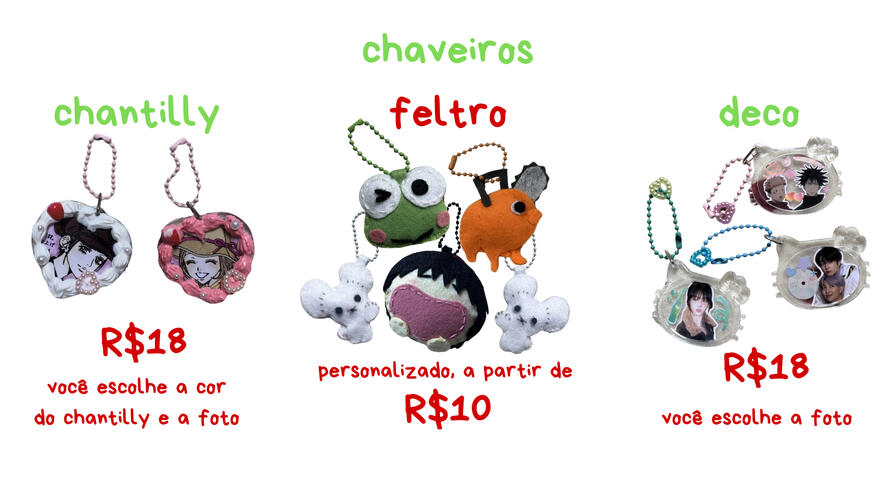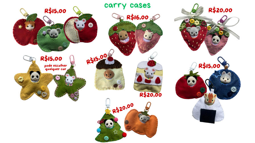 o pagamento é feito no momento do pedido, e o prazo começa a contar à partir dele. aceito pix ou picpay.sobre as carry cases1. não inclui o sylvanian families. é apenas o chaveiro para carregá-lo.2. as cores dos apliques, botões e mosquetão (gancho do chaveiro) não são fixas e variam de acordo com a disponibilidade.3. o prazo para confecção e envio é de até 20 dias úteis. caso haja algum imprevisto eu vou avisar!4. sinta-se à vontade para pedir orçamento de carry cases fora do meu catálogo, ou alteração de cores (ex: quero a estrela, porém roxa)sobre os toploaders/card holders e chaveiros de feltro1. posso criar um design do zero pra você, seguir um design feito por você ou reproduzir algum modelo que você tenha salvo. tenha em mente que não fica 100% fiel, tento chegar o mais próximo possível.2. seja descritivo, me conte sua ideia com o máximo de detalhes possível, me mande imagens de referência. tudo isso facilita o processo de criação da sua peça e contribui para que fique o mais próximo possível do que você deseja!3. o prazo para confecção e envio é de até 20 dias úteis. caso haja algum imprevisto eu vou avisar!sobre os chaveiros de chantilly e deco1. o prazo para confecção e envio é de até 10 dias úteis. caso haja algum imprevisto, eu vou avisar.2. no caso dos chaveiros com foto personalizada, eu não posso utilizar fanarts de terceiros!! me mande apenas artes originais das obras ou fanarts feitas por você, favor especificar.3. aceito pedidos com fotos pessoais, não precisa ser necessariamente de um famoso ou personagem.
